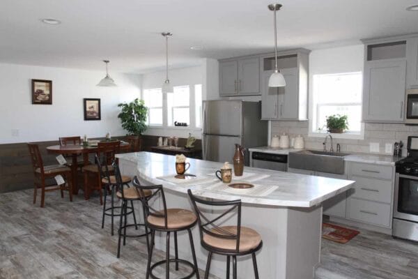 The kitchen features a double barn door walk-in pantry and a huge kitchen island.